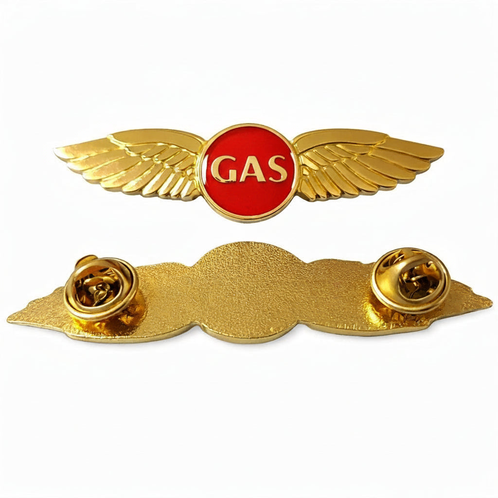 Air Services wings badge sample. Metal with gold and red centre. Company initials in gold lettering.