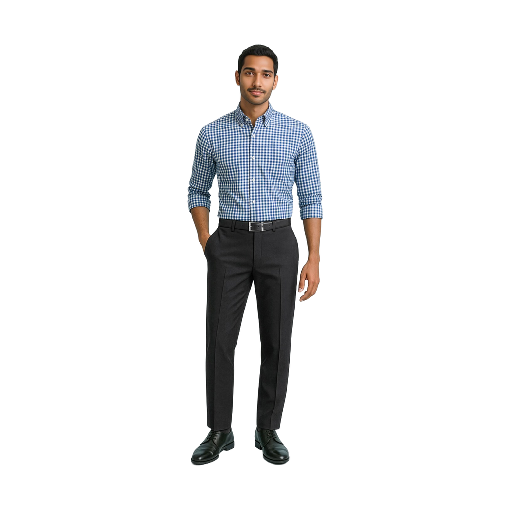 Flat front and tapered through the leg. Waistband with stretch fusing. Internal security pocket on right front pocket, and two rear pockets.